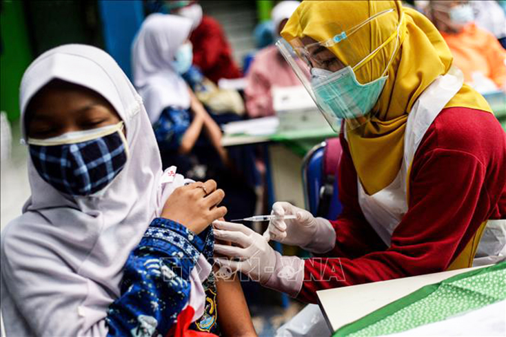 インドネシア・バンテン州の都市であるタンゲランで、新型コロナウイルスワクチン接種を受ける女性=THX/TTXVN |