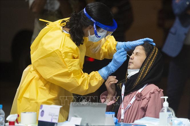タイの首都バンコクで、新型コロナ検査で、 鼻腔から検体を採取する医療従事者=AFP/TTXVN |