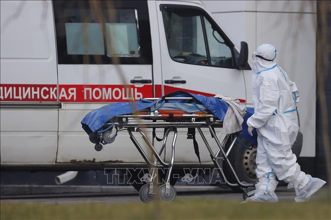 ロシアの首都モスクワで、新型コロナウイルスの患者を運ぶ医療従事者=THX/TTXVN |
