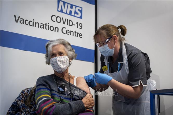 イギリスの首都ロンドンで、新型コロナウイルスワクチン接種を受ける高齢女性=AFP/TTXVN |