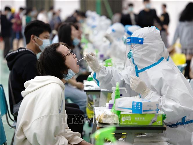 中国・上海で、新型コロナウイルスのPCR検査を受ける女性=THX/TTXVN |