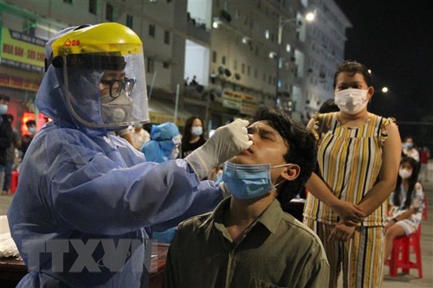 南部ビンズオン省で、新型コロナ検査で、 鼻腔から検体を採取する医療従事者=Văn Hướng/TTXVN |