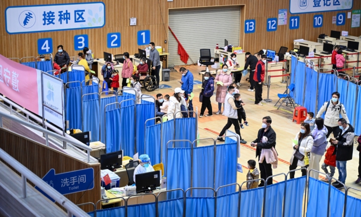 中国・広東省で、新型コロナウイルスワクチン接種のため列に並ぶ人たち=cnsphoto |