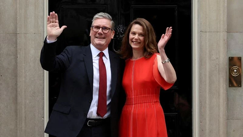 2024年7月5日、ダウニング街10番地のイギリス首相官邸に入るスターマー新首相と妻ビクトリアさん(ロイター) |