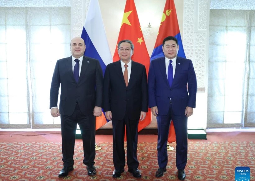 (左から)ロシアのミシュスチン首相、中国の李強首相、モンゴルのオユーンエルデネ首相(写真:新華社) |
