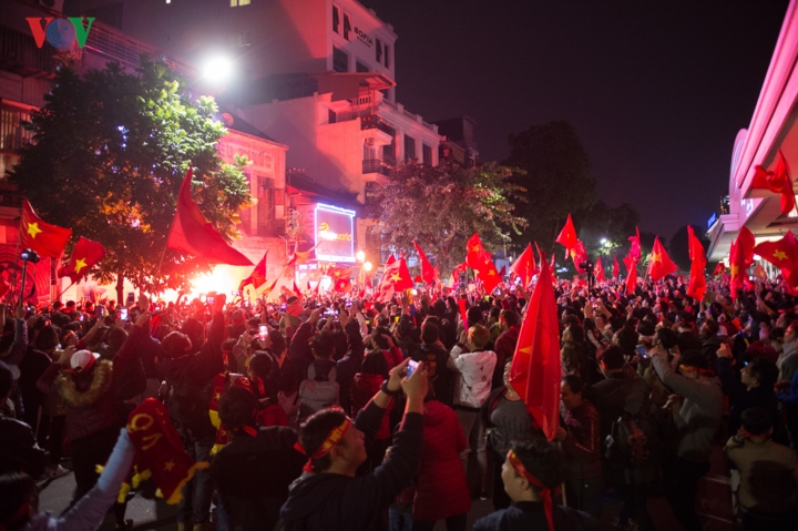 ゴック 大勢の人々が集まって、「ベトナム、優勝!」と叫んだり、代表チームの勝利を祝いました。その雰囲気は言葉で表現できませんが、台風に例えても過言ではありませんね。