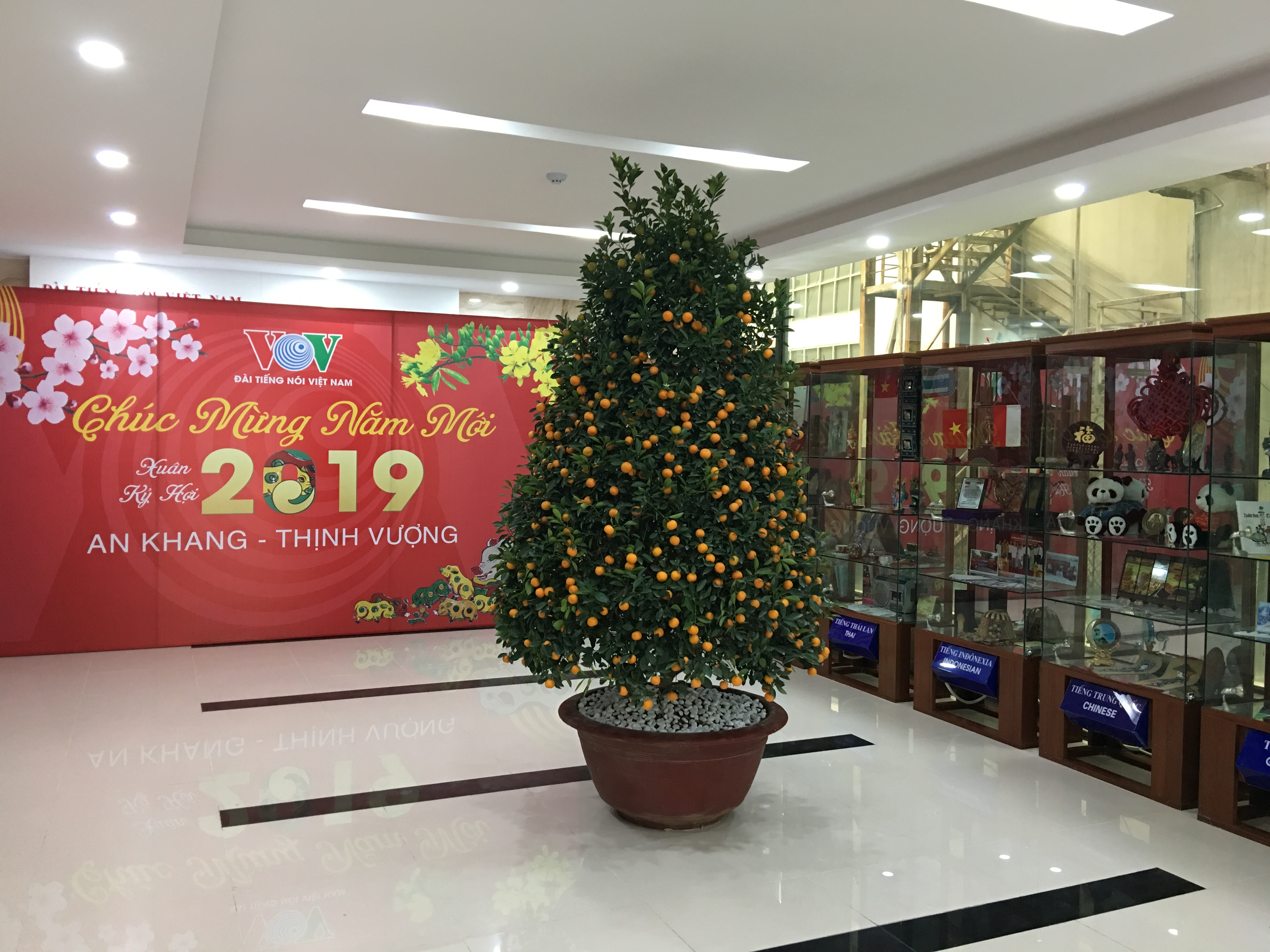 VOV5の本部の中央階段を登って、自動ドアの中に入ると、ロビーがあります。そこには、13言語のブースが並んでいます。ロビーには、天井まで届くような大きな金柑の木が置かれています。 |