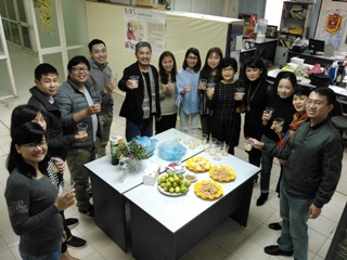 ハー ありがとうございます。今年も、VOVの男性スタッフは、私たちの女性スタッフのために、たくさんの新鮮な果物や、美味しいケーキを買ってきて、お祝いイベントをやってくれましたよ。(左の写真は4階にある日本語課、中国語課、フランス語課、ロシア語課のイベントのものです。一番右にいるソンさんの隣り人は、中国語課スタッフの人、次の3人は日本語課のホアイさん、ゴックさん、ハーさんです。次の3人の女性は韓国語課のスタッフ。次の男性は、アンさん。彼の右に2人の男性はフランス語課、そして残りの3人は中国語課の人たちです。下の写真は3階にある他の言語の放送番組のものです。)
