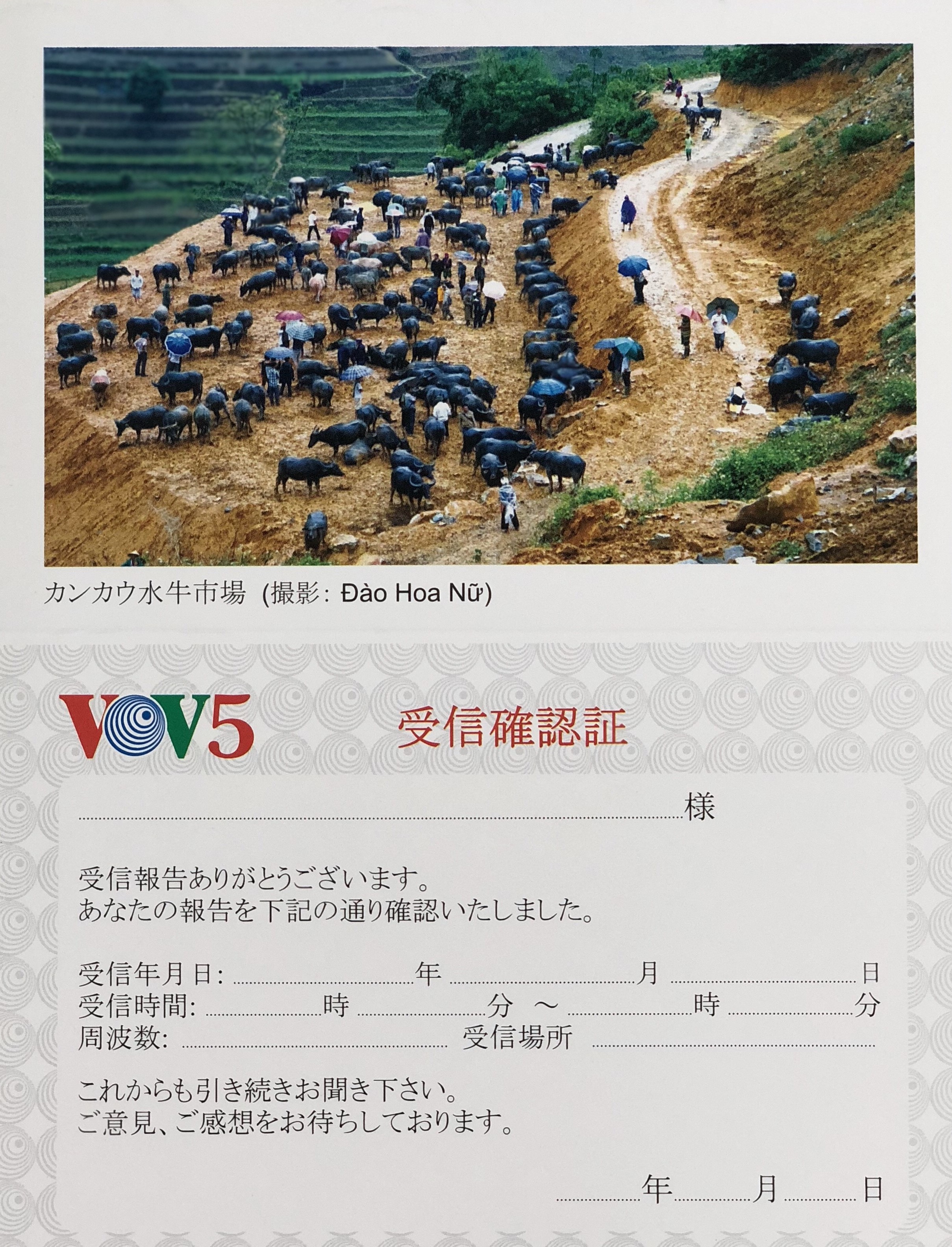 ゴック リスナーの皆さん、VOV日本語放送からお知らせがあります。現在、私たちは新しいべリカード・受信証明書のデザインを進めています。