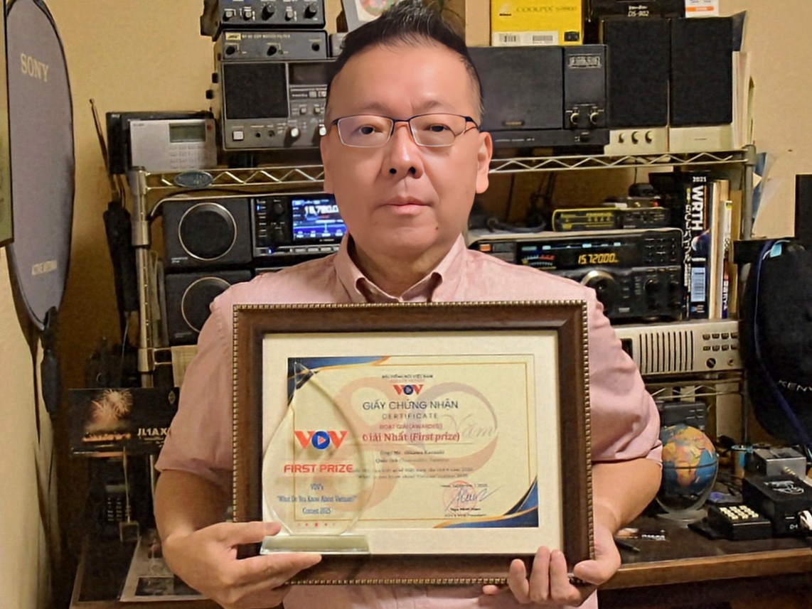 ― このたび、VOVベトナムの声放送局主催「ベトナムについてどれだけ知っていますか2025」コンテストにおいて、最高賞という栄誉ある賞を頂き、心より感謝申し上げます。授賞式ならびに文化交流プログラムに参加する機会をいただき、VOV日本語課の皆様をはじめ、関係者の皆様の温かいご支援とご尽力に深く御礼申し上げます。ベトナム滞在中は、タムコックでのボート体験、古村での瓦絵付けやランタン作り、水上人形劇や書道体験など、五感を通じてベトナム文化に触れる貴重な時間を過ごしました。特に瓦絵の制作では、日本の水墨画と通じる繊細な筆使いや余白の美に共通点を見出し、文化の奥深さに感銘を受けました。また、ベトナム書道における筆運びも、日本の書道と響き合うものがあり、アジアに根差す文化の共通性と豊かさを実感しました。9月25日には、対外向け放送開始80周年記念式典にて、各国の受賞者とともに表彰を受けるという光栄な場に立ち、国際交流の輪の広がりを肌で感じることができました。VOV日本語課の皆様との交流では、放送の裏側にある情熱と誠意に触れ、リスナーとしての喜びと誇りを新たにしました。この経験を通じて、BCL文化の記録者として、ベトナムと日本の文化的架け橋となる活動を今後も続けていきたいと強く思っております。VOVの発展と国際交流の深化に、貢献できるよう努めてまいります。改めまして、VOV日本語課の皆様、そしてVOVWORLDの皆様に心より感謝申し上げます。