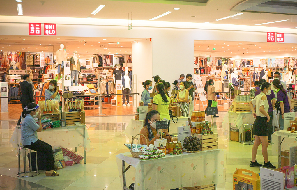 「ユニクロ・バンハイン店」前のスペースに設置されたベトナム農産物の物販ブース=Huỳnh Tân |