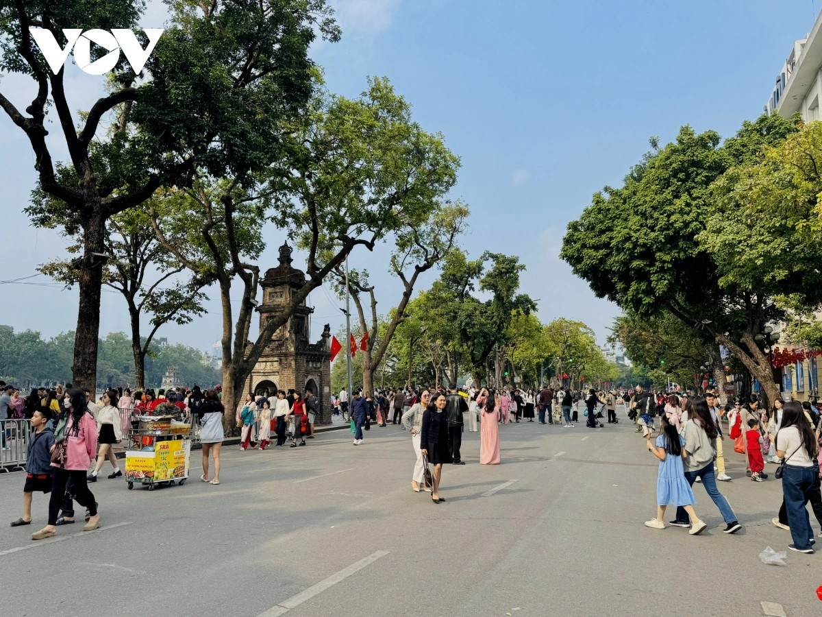 2026年の新年初日、ホアンキエム湖周辺の歩行者空間に集う市民と観光客(写真:Hải Nam/VOV.VN) |