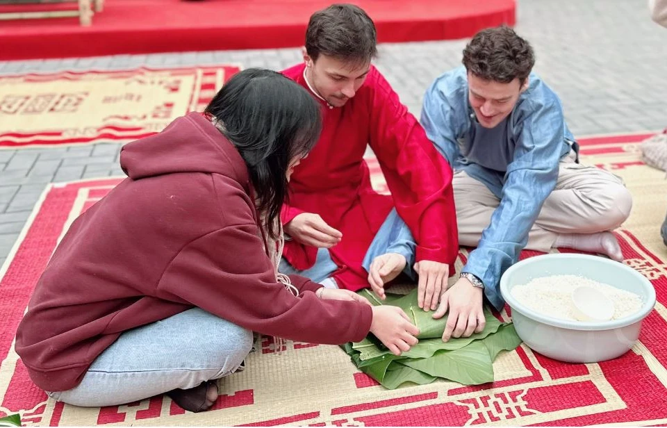 外国人留学生がベトナム風チマキ「バインチュン」作りを体験(写真:Vietnam+) |