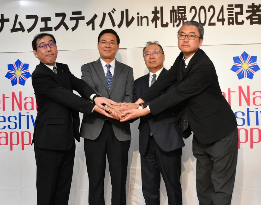 ベトナムフェスを記者会見でPRする在日本ベトナム大使館のファム・クアン・ヒエウ大使(左から2人目)(共同通信) |