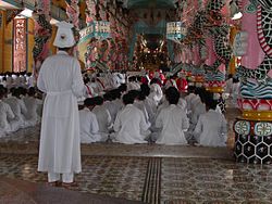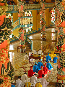 アン そうですね。では、カオダイ教について簡単にご紹介しましょう。カオダイ教は1910年代末にできたベトナムの新興宗教です。儒教、道教、仏教、キリスト教、イスラム教の教理を土台にしたことからカオダイ、漢音で高台と名付けられました。教えとしては、キリスト教、聖職者の階級制度を導入するカトリックの要素がある一方で、古来からの精霊崇拝の要素も見られます。