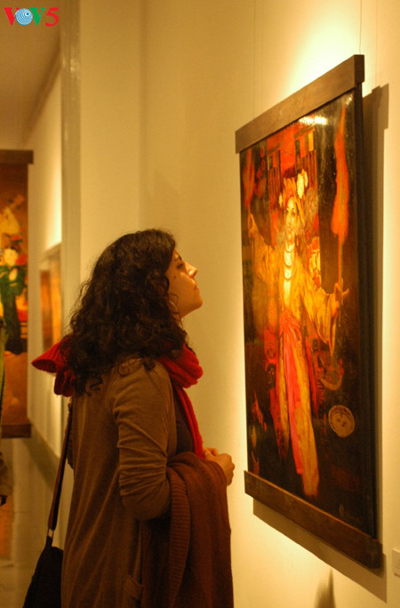 今回の絵画展で、画家チャン・トゥアン・ロン氏がこの20年間に描いた26点の漆絵が展示されています。これらの作品は、漆の特徴を利用してこの信仰の精神や雰囲気を真実に明らかにすることができたと評されています。