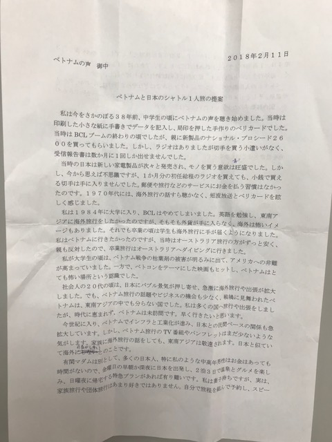 (VOVWORLD) - 3月15日、東京都大田区お住まいの草薙 義弘 さんのエッセイを受け取りましたが、写真で、これをご紹介します。また、これを、18日の放送番組でも伝えられていますので、どうぞお聴き下さい。