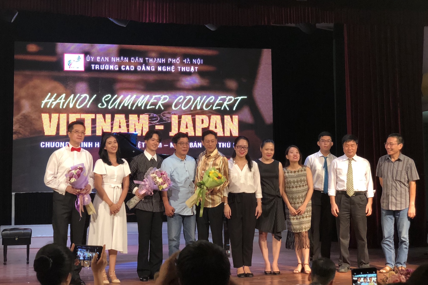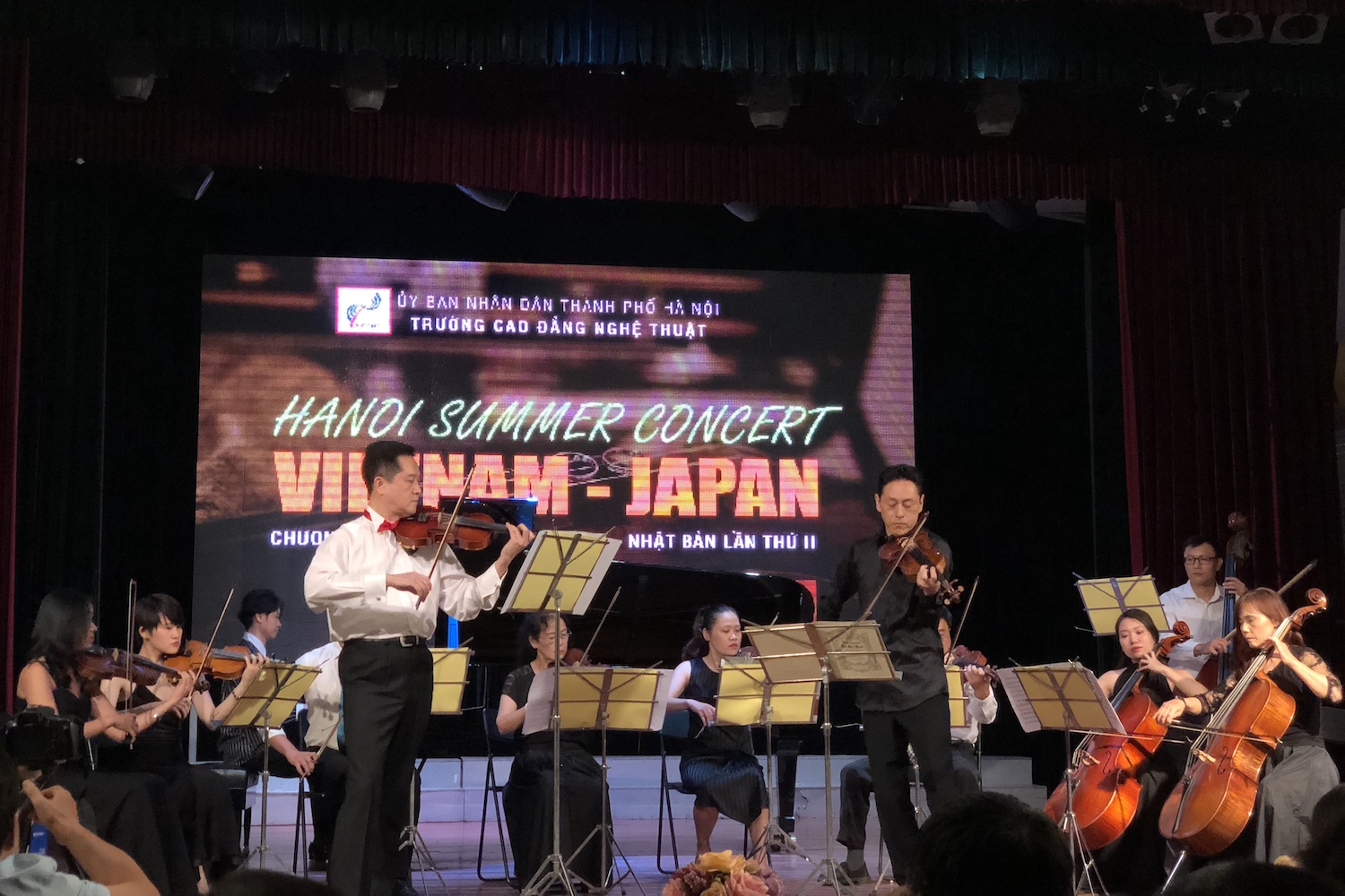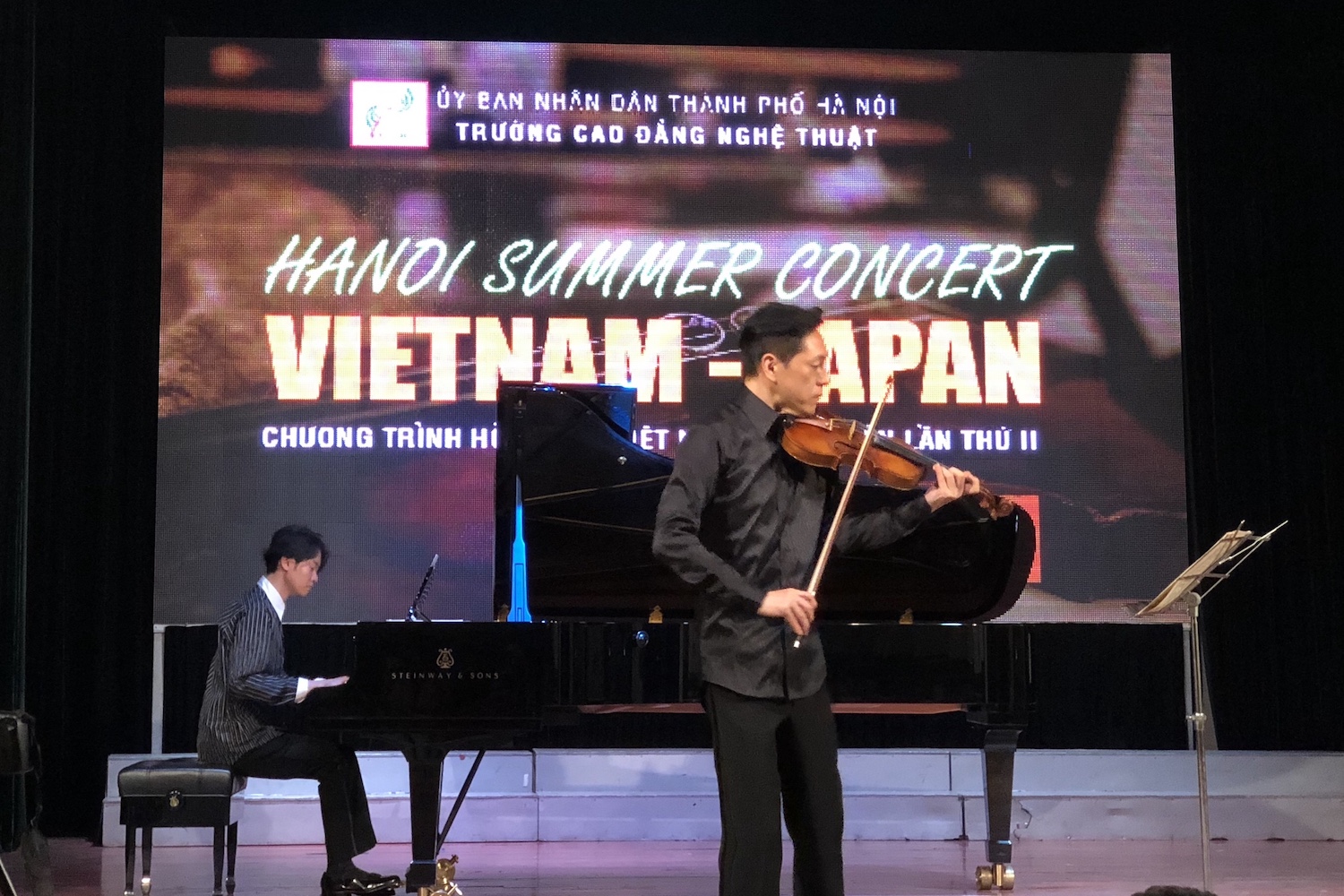 今回のコンサートには、日本からヴァイオリニストの松野迅(まつのじん)さん。ピアニストの榎田まさし(えのきだまさし)さん、ベトナムから作曲家ダン・ヒュウ・フックさん、及びハノイ芸術短期大学の教師、学生らが出演しました。