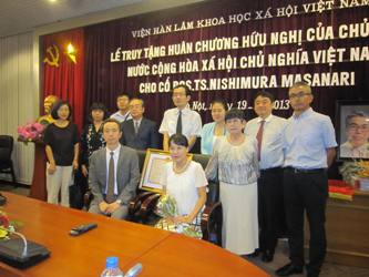 先頃、ベトナムのチュォンタンサン国家主席は日本人の故考古学者 西村昌也博士に対する友好勲章を授与することを決定し、19日午後、ハノイで、ベトナム科学社会研究院の主催により、ベトナム社会科学への貢献、特に考古学、歴史学、博物館額への貢献に対し、この友好勲章の授与式が行われました。