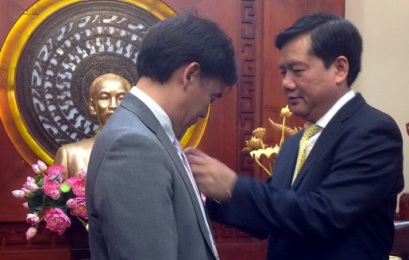 16日、ホーチミン市党委員会のディン・ラ・タン委員長は、JICA=日本国際協力機構ベトナム事務所の森睦也所長と会見を行い、ホーチミン市の記章を授与しました。