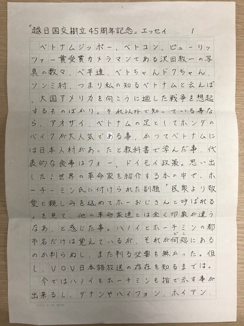 今ではハノイもホーチミンも指で示す事が出来るし、ダナンやハイフォン、ホイアン、ドンホー村やバッチャン村の場所だって人に教えられる。ベトナムには54の民族が共存しているし、美女が多いのもVOVのホームページから教えてもらった。火を吹く橋なんて信じられ無いぐらいかっこいい。ベトナム料理を口にした経験はまだ一度も無いのだが、隣の県に有名なベトナム料理店があると知り、何としても行かねばならぬとその気になっている。嗚呼、ベトナムフェスタが新潟でも開催されれば良いのになあ・・・。そして今「越日国交樹立45周年記念」エッセイに応募する私がここにいる。