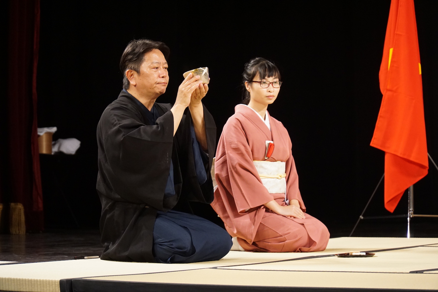 献茶式で、大宗匠は茶道の精神について触れられ、一碗のお茶を通して相手を思いやる心、触れ合いの心を感じて欲しいと講じられまた。その後、茶道のデモンストレーションを披露しました。