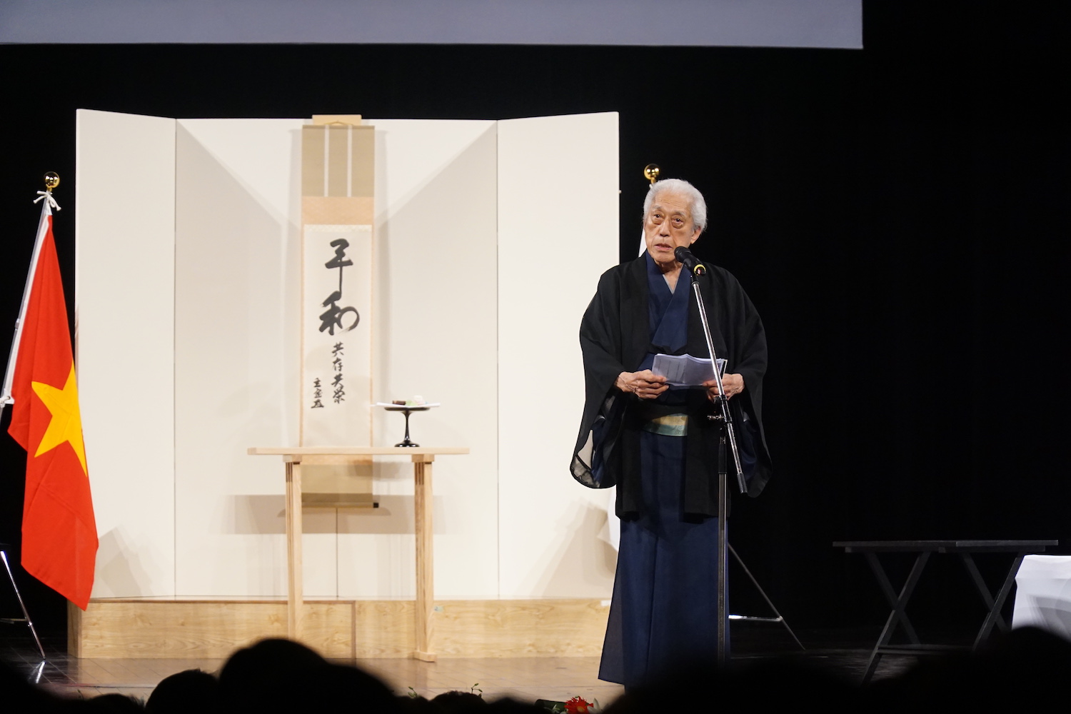 行事では、「一碗の茶から平和を」の精神を唱え、世界60カ国の300あまりの茶会に参加した千玄室大宗匠による献茶式、和合の茶会、記念講演、茶道のデモンストレーションなどが行なわれました。両国の国交樹立45周年あたり、ベトナムを3回目訪れた千玄室大宗匠は次のように話しました。