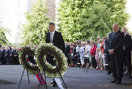 北欧のノルウェーで、若者ら77人が銃撃されるなどして殺害されたテロ事件から22日で1年となり、追悼式典に出席したストルテンベルグ首相は、テロに屈せず民主主義を守り抜こうと国民に訴えましました。この事件は、去年7月、ノルウェーの首都オスロの官庁街で、爆弾が爆発したのに続いて、郊外の島で開かれていた与党の青年大会で銃が乱射され、若者ら77人が死亡したもので、極右的な思想を持ち、政府の移民政策に反発するアンネシュ・ブライビーク被告(33)が逮捕され、テロの罪に問われています。事件から1年となる22日、乱射事件の現場となったオスロ郊外の島では、犠牲者の遺族などおよそ1000人が出席して追悼式典が開かれました。