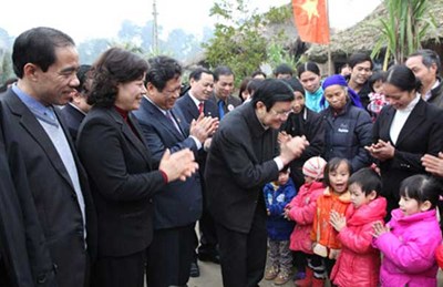 テトにあたり、グェン・フー・チョン共産党書記長、チュオン・タン・サン国家主席を始め、党と政府の指導者らは共産党や政府の元指導者や科学者、貧困世帯の家庭を訪れ、テトの挨拶を送りました。グエン・フー・チョン共産党書記長はハノイ市、タク・タット県を訪れ、党委員会、行政府、及び住民にテトのお祝いの言葉を述べるとともに、「工業化・現代化を進めるに際し、環境保全、人と人との付き合いの強化に力を尽くさなければならない」と強調しました。チョン書記長は次のように語りました。