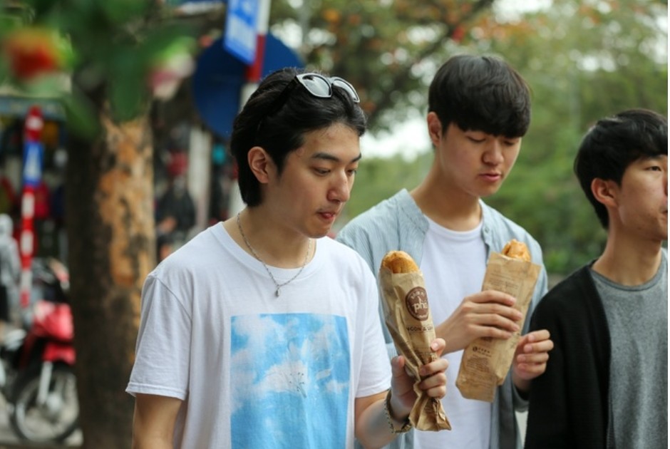 韓国人観光客がバインミーを味わう(写真:Giang Ngọc/thanhnien.vn ) |