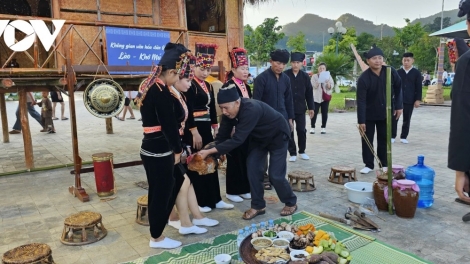 (VOVWORLD) - នៅក្នុងបរិយាកាសនៃភូមិទេសចរណ៍សហគមន៍ Na Khuong ឃុំ Ban Bo ខេត្ត Lai Chau សំឡេងគង់ឃ្មោះលឺកងរំពង ដ៏រំជួលចិត្តលាយឡំជាមួយរបាំ Xòe ដ៏រស់រវើកនៅក្នុងពិធីបុណ្យ Xoe Chieng ក្នុងអំឡុងពេលឆ្នាំថ្មី ដែលបន្លឺឡើងពាសពេញព្រៃភ្នំ។ ពិធីបុណ្យ Xoe Chieng របស់ជនជាតិថៃនៅទីនេះ មិនត្រឹមតែរក្សាព្រលឹងវប្បធម៌របស់ក្រុមជនជាតិខ្លួនប៉ុណ្ណោះទេ ថែមទាំង ក្លាយជាទីណាត់ជួបជុំសម្រាប់ចំណងមិត្តភាពសហគមន៍ លើកកម្ពស់សក្តានុពលទេសចរណ៍ និងផលិតផលប្រចាំតំបន់ផងដែរ។