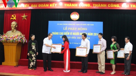 (VOVworld) - នាព្រឹកថ្ងៃទី១៧តុលា នៅរដ្ឋធានីហា ណូយ គណៈកម្មាធិការមជ្ឈឹមរណសិរ្សមាតុភូមិវៀត ណាម បានរៀបចំពិធីបំផុសខែ កំពូលដើម្បីជនក្រីក្រ ឆ្នាំ២០១៤ (ពីថ្ងៃទី១៧តុលាដល់ទី១៨វិច្ឆិកា)។
