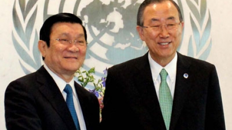 (VOVworld) – ក្នុងក្របខ័ណ្ឌដំណើរទស្សនកិច្ចនៅអាមេរិក ប្រធានរដ្ឋវៀតណាម លោក Truong Tan Sang ជួបជាមួយអគ្គលេខាធិការ អ.ស.ប. លោក Ban Ki-moon នៅទីក្រុង New York។