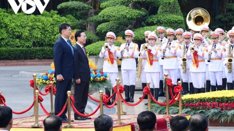 (VOVWORLD) - តបតាមការអញ្ជើញរបស់លោកប្រធានរដ្ឋវៀតណាមលោក Vo Van Thuong និងលោកជំទាវ ប្រធានាធិបតីម៉ុងហ្គោលីលោក Ukhnaagiin Khurelsukh និងលោកជំទាវបានបំពេញទស្សនកិច្ចផ្លូវរដ្ឋនៅវៀតណាម ចាប់ពីថ្ងៃទី១ ដល់ថ្ងៃទី ៥ វិច្ឆិកា។ នារសៀលថ្ងៃទី ១ វិច្ឆិកា នៅវិមានប្រធានរដ្ឋ ប្រធានរដ្ឋវៀតណាមលោក Vo Van Thuong បានអញ្ជើញជាអធិបតីក្នុងពិធីទទួលបដិសណ្ឋារកិច្ចយ៉ាងឱឡារិកចំពោះប្រធានាធិបតីម៉ុងហ្គោលី តាមពិធីកិច្ចថ្នាក់រដ្ឋ។
