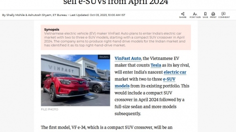 (VOVWORLD) - VinFast Auto ដែលជាក្រុមហ៊ុនផលិតរថយន្តអគ្គិសនីរបស់វៀតណាមនឹងឈានចូលទីផ្សាររថយន្តឥណ្ឌានាពេលខាងមុខ រួមទាំងលទ្ធភាពនៃការបើករោងចក្រនៅក្នុងប្រទេសអាស៊ីខាងត្បូងនេះផងដែរ។ ក្រុមហ៊ុនរថយន្តនឹងលក់រថយន្តអគ្គិសនីចំនួន ៣ ម៉ូដែលក្នុងទីផ្សារនេះដែលមានមនុស្ស ១,៤ ពាន់លាននាក់ ចាប់ពីខែមេសាឆ្នាំក្រោយ។ ព័ត៌មាននេះត្រូវបានចុះផ្សាយនៅលើកាសែត Economic Times របស់ឥណ្ឌា កាលពីថ្ងៃទី ៣ ខែតុលា។