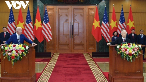 (VOVWORLD) - នាថ្ងៃទី ១០ ខែកញ្ញា នៅទីក្រុងហាណូយ បន្ទាប់ពីជំនួបពិភាក្សាកំពូលមក អគ្គលេខាបក្សលោក Nguyen Phu Trong និងប្រធានាធិបតីអាមេរិក លោក Joe Biden អញ្ជើញថ្លែងទៅកាន់សារព័ត៌មានអំពីលទ្ធផលល្អប្រសើរនៃកិច្ចពិភាក្សា ហើយបានប្រកាសថា ភាគីទាំងពីរបានអនុម័តលើសេចក្តីថ្លែងការណ៍រួម ដោយលើកកំពស់ទំនាក់ទំនងវៀតណាម - អាមេរិកទៅជា “ភាពជាដៃគូយុទ្ធសាស្ត្រគ្រប់ជ្រុងជ្រោយដើម្បីសន្តិភាព កិច្ចសហប្រតិបត្តិការ និងការអភិវឌ្ឍប្រកបដោយចីរភាព”។