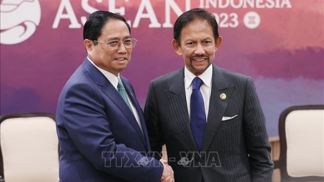 (VOVWORLD) - នាព្រឹកថ្ងៃទី៦ខែកញ្ញានៅទីក្រុងហ្សាកាតាប្រទេសឥណ្ឌូនេស៊ីក្នុងឱកាសអញ្ជើញចូលរួមកិច្ចប្រជុំកំពូលអាស៊ានលើកទី៤៣និងកិច្ចប្រជុំពាក់ព័ន្ធនានានាយករដ្ឋមន្ត្រីវៀតណាម លោក Pham Minh Chinh បានអញ្ជើញជួបជាមួយព្រះមហាក្សត្រប្រ៊ុយណេDarussalam Sultan Haji Hassanal Bolkiah។