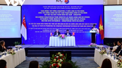 (VOVWORLD) - ក្នុងក្របខ័ណ្ឌដំណើរទស្សនកិច្ចជាផ្លូវការនៅវៀតណាមរបស់នាយករដ្ឋមន្ត្រីសាធារណរដ្ឋសឹង្ហបុរី លោក Lee Hsien Loong នារសៀលថ្ងៃទី២៩ ខែសីហា នៅទីក្រុងហាណូយ នាយករដ្ឋមន្ត្រីវៀតណាមលោក Pham Minh Chinh និងនាយករដ្ឋមន្ត្រីសឹង្ហបុរី លោក Lee Hsien Loong ជាមួយលោកជំទាវ បានជួបពិភាក្សាជាមួយគណៈប្រតិភូថ្នាក់ដឹកនាំវ័យក្មេងវៀតណាម - សឹង្ហបុរី។