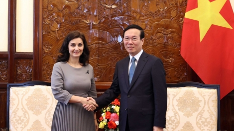 (VOVWORLD) - នាព្រឹកថ្ងៃទី៩ មិថុនា នៅវិមានប្រធានរដ្ឋ ប្រធានរដ្ឋវៀតណាមលោក Vo Van Thuong បានទទួលជួបលោកស្រី Marinela Petkova ឯកអគ្គរដ្ឋទូតប៊ុលហ្គារី ដែល មកជម្រាបលាក្នុងឱកាសបញ្ចប់អាណត្តិបេសកកម្មនៅវៀតណាម។
