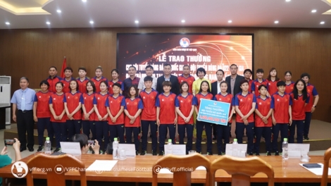 (VOVWORLD) - នាថ្ងៃទី ២៣ ឧសភា នៅទីស្នាក់ការសហព័ន្ធកីឡាបាល់ទាត់វៀតណាម (VFF) នៅទីក្រុងហាណូយបានបើកពិធីប្រគល់រង្វាន់ជូនក្រុមបាល់ទាត់នារីវៀតណាម និងក្រុមបាល់ទាត់ U.២២ វៀតណាម។