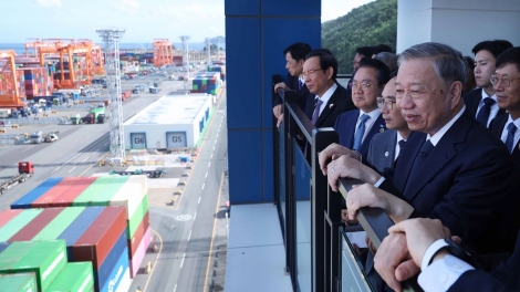 (VOVWORLD) - បន្តសកម្មភាពនៅទីក្រុងប៊ូសាន (កូរ៉េខាងត្បូង) នារសៀលថ្ងៃទី ១៣ សីហា អគ្គលេខាបក្សកុម្មុយនិស្តវៀតណាម លោក តូ ឡឹម បានអញ្ជើញទៅទស្សនា និងស្តាប់ការឧទ្ទេសនាមអំពីបច្ចេកវិទ្យាប្រតិបត្តិការកំពង់ផែស្វ័យប្រវត្តិ ១០០% នៅកំពង់ផែ ប៊ូសាន ដែលជាកំពង់ផែសមុទ្រឈានមុខគេនៅលើពិភពលោកក្នុងវិស័យ ស្វ័យប្រវត្តិកម្ម ធ្វើមូលដ្ឋានីយកម្មទាំងស្រុង និងស្និតស្នាលជាមួយបរិស្ថាន។