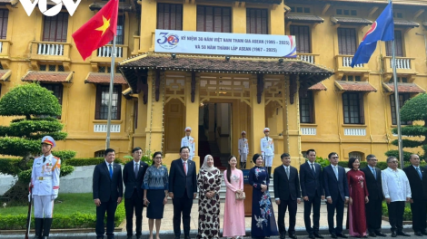 (VOVWORLD) - អបអរសាទរខួបលើកទី ៥៨ នៃការបង្កើតសមាគមប្រជាជាតិអាស៊ីអាគ្នេយ៍ - អាស៊ាន (៨ សីហា ១៩៦៧ - ៨ សីហា ២០២៥) និងខួបលើកទី ៣០ ដែលវៀតណាមចូលជាសមាជិកអាស៊ាន (២៨ កក្កដា ១៩៩៥ - ២៨ កក្កដា ២០២៥) នៅទីស្នាក់ការក្រសួងការបរទេសវៀតណាម (នៃទីក្រុងហាណូយ) ក្រសួងការបរទេសវៀតណាមបានប្រារព្ធពិធីបង្ហូតទង់អាស៊ាន។