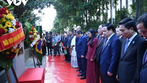 (VOVWORLD) - ក្នុងកម្មវិធីចូលរួមកិច្ចប្រជុំកំពូល BRICS ២០២៥ និងសកម្មភាពទ្វេភាគីនៅប្រទេសប្រេស៊ីល នាព្រឹកថ្ងៃទី ៥ ខែកក្កដា (ម៉ោងក្នុងតំបន់) បន្ទាប់ពីបានចុះចតនៅអាកាសយានដ្ឋាន Galeao នៅទីក្រុង Rio de Janeiro នាយករដ្ឋមន្ត្រី លោក ហ្វាម មិញ ជិញ និងភរិយារួមជាមួយគណៈប្រតិភូ ជាន់ខ្ពស់វៀត ណាមបានអញ្ជើញដាក់ផ្កាក្នុងឱកាសរំលឹកខួបលើកទី ១៣៥ នៃទិវាកំណើតលោកប្រធាន ហូជីមិញ នៅទីក្រុង Rio de Janeiro។