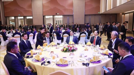 (VOVWORLD) - នាព្រឹកថ្ងៃទី១០ ខែតុលា ក្នុងឱកាសអញ្ជើញចូលរួមកិច្ចប្រជុំកំពូលសមាគមប្រជាជាតិអាស៊ីអាគ្នេយ៍ (អាស៊ាន) លើកទី៤៤ និង៤៥ នៅទីក្រុងវៀងចន្ទន៍ ប្រទេសឡាវ នាយករដ្ឋមន្ត្រីវៀតណាម លោក ផាម មិញជីញ នាយករដ្ឋមន្ត្រីឡាវ លោក សនសៃ ស៊ីផាន់ដន និងនាយករដ្ឋមន្ត្រីកម្ពុជា លោក ហ៊ុន ម៉ាណែត មានជំនួបពិសារអាហារពេលព្រឹកពិសេស ជាមួយក្រុមប្រឹក្សាធុរកិច្ចអាស៊ាន។