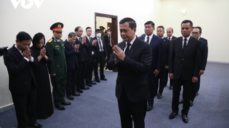 (VOVWORLD) - នាព្រឹកថ្ងៃទី ២៦ ខែកក្កដា នាយករដ្ឋមន្ត្រីកម្បុជា សម្ដេចមហាបវរធិបតី ហ៊ុន ម៉ាណែត បានដឹកនាំគណៈប្រតិភូរាជរដ្ឋាភិបាលកម្ពុជា អញ្ជើញមកគោរពវិញ្ញាណក្ខន្ធអគ្គលេខាបក្សកុម្មុនីស្តវៀតណាម លោក Nguyen Phu Trong នៅស្ថានទូតវៀតណាមក្នុងរាជធានីភ្នំពេញ។