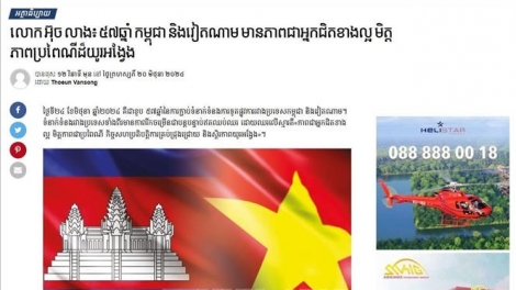 (VOVWORLD) - ក្នុងឱកាសរំលឹកខួបលើកទី ៥៧ ទិវាបង្កើតទំនាក់ទំនងការទូតរវាងវៀតណាមនិងកម្ពុជា (២៤ មិថុនា ១៩៦៧ - ២៤ មិថុនា ២០២៤) នាប៉ុន្មានថ្ងៃថ្មីៗនេះ បណ្ដាទីភ្នាក់ងារសារព័ត៌មានកម្ពុជា បានចុះផ្សាយអត្ថបទ និងរូបភាពជាច្រើនដោយរំលេចទំនាក់ទំនងល្អប្រសើរ រឹងមាំយូរអង្វែងរវាងប្រទេសជិតខាងទាំងពីរ។