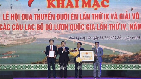 (VOVWORLD) - កាលពីយប់ថ្ងៃទី ៣១ ខែធ្នូ មហោស្រពកីឡាប្រណាំងទូក លើកទី ៩ និងការប្រកួតជើងឯកក្លឹបលោតឆត្រយោងជាតិលើកទី ៤ បានបើកនៅទីរួមខេត្ត Muong Lay ខេត្ត Dien Bien។ ព្រឹត្តិការណ៍នេះបានប្រព្រឹត្តទៅចាប់ពីថ្ងៃទី ៣១ ខែធ្នូ ឆ្នាំ ២០២៣ ដល់ថ្ងៃទី ៣ ខែមករា ឆ្នាំ ២០២៤។