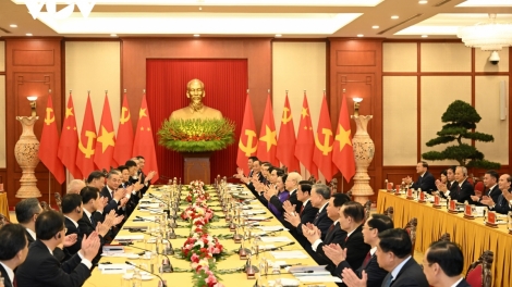 (VOVWORLD) - នារសៀលថ្ងៃទី ១២ ធ្នូ នៅទីស្នាក់ការគណៈកម្មាធិការមជ្ឈិមបក្ស (នៃទីក្រុងហាណូយ) បន្ទាប់ពីពិធីទទួលបដិសណ្ឋារកិច្ចជាផ្លូវការ អគ្គលេខាគណៈ កម្មាធិការមជ្ឈិមបក្សកុម្មុយនិស្តវៀតណាម លោក Nguyen Phu Trong បានអញ្ជើញជួបពិភាក្សាការងារជាមួយអគ្គលេខា គណៈកម្មាធិការមជ្ឈិមបក្សកុម្មុយនិស្ត ចិន ប្រធានរដ្ឋនៃសាធារណរដ្ឋប្រជាមានិតចិន លោក Xi Jinping។