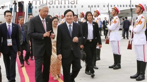 (VOVworld)-ប្រធានាធិបតីសាធារណរដ្ឋសហភាព មីយ៉ាន់ម៉ាលោក Htin Kyaw និង លោកជំទាវកំពុងមាន ដំណើរទស្សនកិច្ចថ្នាក់រដ្ឋនៅវៀតណាមចាប់ពីថ្ងៃទី២៦ ដល់ថ្ងៃទី ២៨តុលា តាមសេចក្តីអញ្ជើញរបស់ប្រធាន រដ្ឋលោក Tran Dai Quang ។ដំណើរ ទស្សនកិច្ចនេះជាព្រឹត្តិការណ៍នយោ បាយសំខាន់រវាងប្រទេសទាំងពីរផងដែរ។