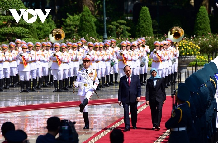 ប្រធានរដ្ឋវៀតណាម លោក Nguyen Xuan Phuc អញ្ជើញជាអធិបតីពិធីទទួលបដិសណ្ឋារកិច្ចប្រធានាធិបតីសិង្ហបុរី លោកស្រី Halimah Yacob។ (រូបថត៖ VOV) |